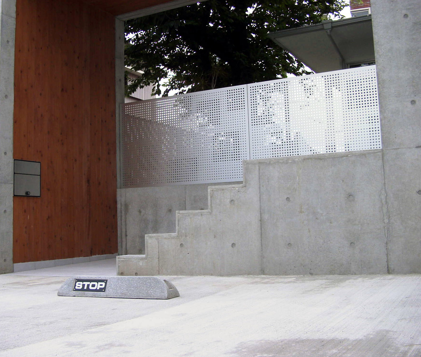 1本で殆どの車種に対応でき、タイヤの停車位置よりもプレートが外側にくるよう設計、停車位置を見ながらバックできるため、とにかく見やすく、車庫入れの苦手な方をしっかりサポートします。また施工の簡略化、コストの削減、工期の短縮、エコセメントの使用により環境への対策を図っています。